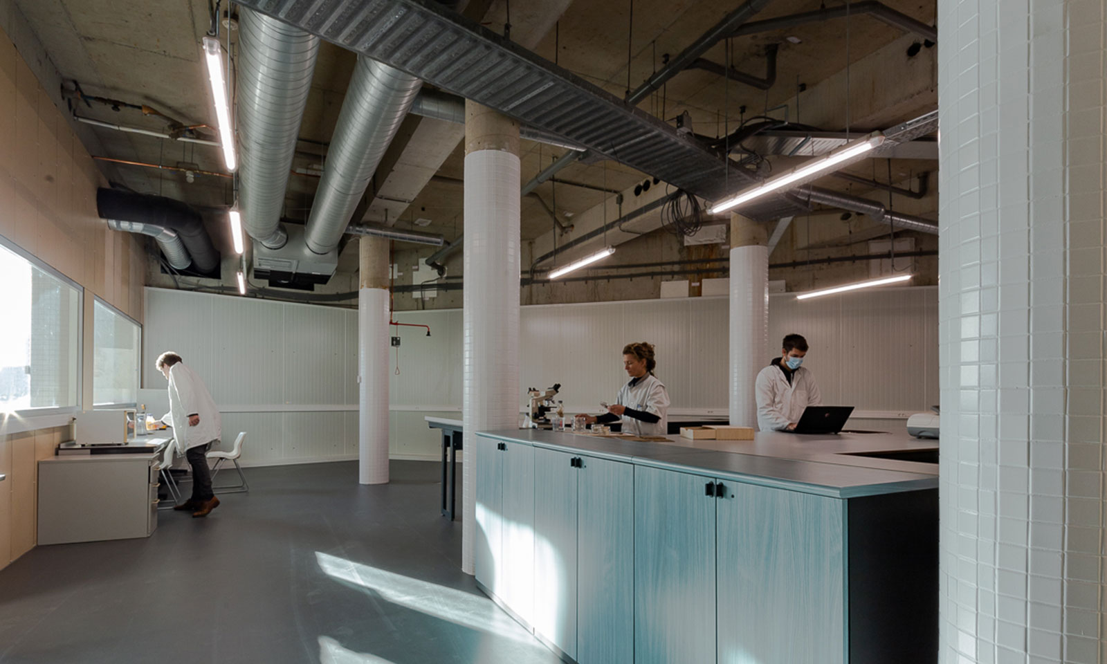 Door de verbouwing van BlueCity Lab en de FoodHub, iets verderop in de kelders, grotendeels uit te voeren met hergebruikte materialen – een schijnbaar onmogelijke opgave, gelet op de eisen gesteld aan dit soort ruimtes – is 112.000 kg CO2-equivalent bespaard. Hiervoor rijd je 643 keer met een personenauto vanaf BlueCity naar Parijs heen en weer, of anderhalf keer naar de maan. Het Lab draait bovendien op zonnepanelen.